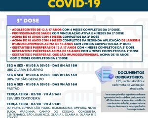 A imunização de terceira dose para todos acima dos 12 anos continua na próxima semana. Já as repescagens de segunda e de primeira aplicações serão promovidas nos próximos dias, em qualquer posto do município.