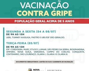 Quem tem mais de cinco anos poderá receber a dose na Universidade Estadual do Rio de Janeiro (UERJ), no Posto de Saúde Dr. Tunney Kassuga (Olaria), no Ginásio Poliesportivo Alberto da Rosa Pinheiro, o Pastão, em Conselheiro Paulino, e na UBS/ESF de São Geraldo de segunda a sexta-feira. Na terça-feira, 05, a campanha também ocorre nas seguintes Estratégias de Saúde da Família: Cordoeira, Mury, Stucky, Lumiar, São Pedro da Serra, Riograndina, Amparo, Nova Suíça, Varginha, Campo do Coelho, Conquista, Centenário, São Lourenço, Olaria I, Olaria II e Olaria III.