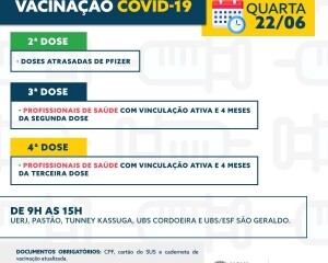 Os adolescentes que já tomaram a 2ª dose há pelo menos quatro meses poderão receber o reforço da covid-19 na segunda-feira, 20. Os adultos com mais de 50 anos poderão receber a 4ª dose na terça-feira, 21. Neste dia também haverá a aplicação da 3ª e da 2ª dose. Já os profissionais de saúde deverão receber o segundo reforço na quarta-feira, 22.