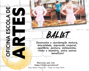 BALÉ – Desenvolve a coordenação motora, lateralidade, expressão corporal, equilíbrio, postura, autoestima, ritmo e memória, entre outros benefícios. Pode ser frequentado por crianças e adolescentes de 4 a 17 anos, com aulas às quintas e sextas-feiras.