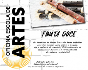 FLAUTA DOCE – Os benefícios da flauta doce vão desde trabalhar questões musicais como ritmo e melodia até a melhoria da memória, desenvolvimento da coordenação motora e o fortalecimento do sistema respiratório. É destinado à faixa etária de 8 a 13 anos, com aulas às quintas-feiras.