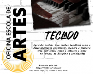 TECLADO – Aprender a tocar teclado traz muitos benefícios como o desenvolvimento psicomotor, melhora a memória, traz bem-estar, reduz o estresse e ajuda na leitura, na disciplina e socialização. Crianças e adolescente entre 7 e 17 anos podem se matricular e frequentar as aulas às segundas e quartas-feiras.