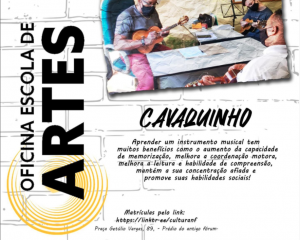 CAVAQUINHO – Aprender a tocar um instrumento musical tem muitos benefícios como o aumento da capacidade de memorização, melhora a coordenação motora, melhora a leitura e a habilidade de compreensão, melhora a coordenação motora e a habilidade de compreensão, mantém a compreensão afiada e promove as habilidades sociais. Pode ser frequentado por crianças e jovens de 9 a 17 anos, com aulas às quintas-feiras.