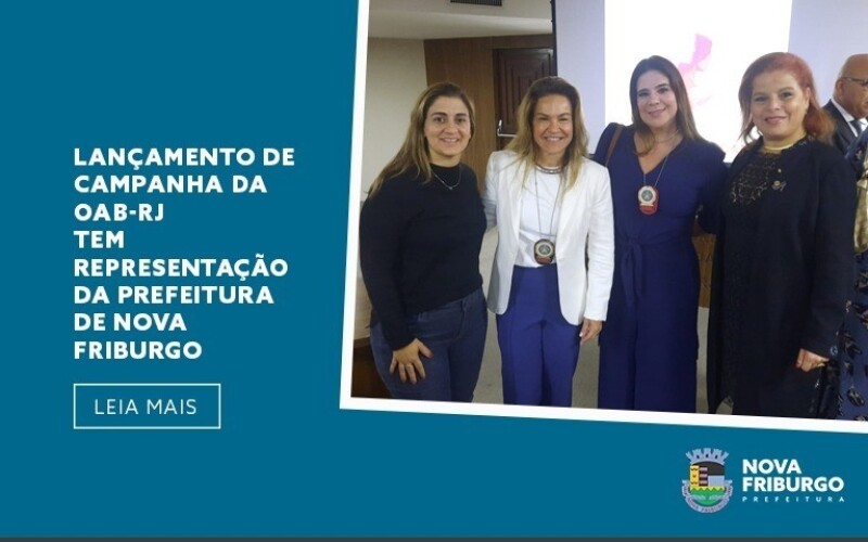 Na última segunda-feira, 16 de junho, foi realizado na sede da Ordem dos Advogados do Brasil no Rio de Janeiro (OAB-RJ), no Castelo, o lançamento da campanha “Ser Advogada não me salva”. Na mesma solenidade houve a posse da nova diretoria da Ouvidoria da Mulher. A Prefeitura de Nova Friburgo foi representada pelas advogadas Rosângela Cassano, gerente da Proteção Especial, e Paula Bairral, coordenadora do Centro de Referência Especializado da Mulher (Crem), equipamentos que integram a Secretaria de Desenvolvimento Social e Direitos Humanos, que tem como secretário o também advogado Yuri Guimarães.