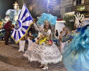 RAIO DE LUAR – “Duas Pedras vem clamar por tolerância / O meu grito é pra afastar a ignorância / Seja do axé, seja do amém / O bem que eu quero pra mim, quero pra você também” – Tradicional escola do bairro Duas Pedras, a Raio de Luar tem como presidente Jorge Elei Sanches e os carnavalescos Rangel e Antônio Souza. Desfilou com 700 componentes que levaram à avenida o enredo “África, raiz da humanidade, seu sonho de liberdade é um grito de fé”. A azul e branco encerrou o desfile na Alberto Braune já com público reduzido e temperatura de dez graus.