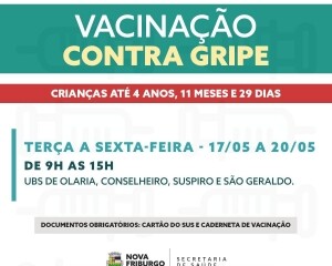 A Secretaria Municipal de Saúde de Nova Friburgo realizará a vacinação contra a gripe na cidade na próxima semana de terça a sexta-feira para idosos, gestantes, puérperas, crianças e grupo prioritário.