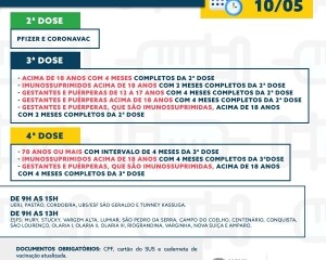 A Prefeitura, através da Secretaria Municipal de Saúde, realizará na próxima terça-feira, 10, a aplicação da quarta dose da vacinação contra a Covid-19 em idosos com mais de 70 anos e imunossuprimidos. Neste dia também será oferecida a terceira e a segunda aplicação para a população.