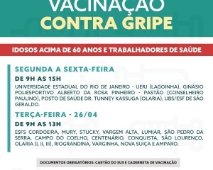 A vacinação nas Estratégias de Saúde da Família dos bairros Cordoeira, Mury, Stucky, Vargem Alta, Lumiar, São Pedro da Serra, Campo do Coelho, Centenário, Conquista, São Lourenço, Olaria (I, II, III), Riograndina, Varginha, Nova Suíça e Amparo acontece na terça-feira, 26, de 09 às 13 horas.