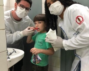 Um KIT de higiene bucal contendo creme dental, escova de dente e fio dental foi distribuído para os alunos do colégio. Eles passaram por avaliação para investigação de casos de cárie e participaram de ações de incentivo à escovação.