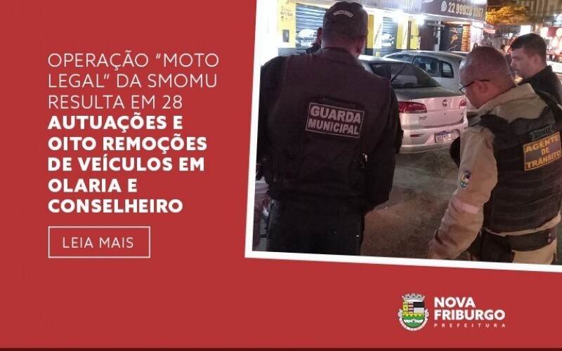 A Prefeitura de Nova Friburgo, através da Secretaria Municipal de Ordem e Mobilidade Urbana (Smomu), com apoio da Guarda Civil Municipal (GCM), realizou nas noites de sexta-feira, 8 de abril, e sábado, 9 de abril, a operação “Moto Legal”. A ação, realizada em Olaria e no distrito de Conselheiro Paulino e cujo objetivo é coibir a prática de infrações e irregularidades por motociclistas, resultou em 28 autuações e oito remoções de veículos ao pátio da Smomu.