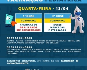 De 09 ás 13 horas, o imunizante da Coronavac, estará disponível para primeira e segunda dose para crianças de 6 a 11 anos sem comorbidade nas ESFs dos seguintes bairros: Varginha, Nova Suíça, Amparo, Olaria (II, III), Campo do Coelho, Centenário, Lumiar, São Pedro da Serra, Mury, Stucky, Vargem Alta e Riograndina.
