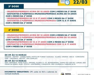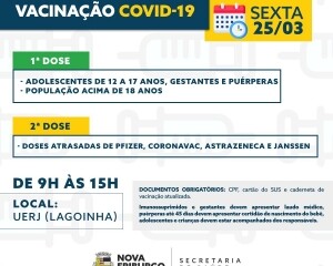Ainda sobre imunização para toda a população, a Prefeitura realizará uma repescagem de primeira e segunda dose, na sexta-feira, 25, para os adolescentes com 12 a 17 anos, gestantes, puérperas e adultos acima de 18.