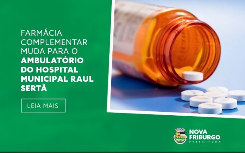 Nesta quinta-feira, 17, tem início a mudança da farmácia complementar de Nova Friburgo para o ambulatório do Hospital Municipal Raul Sertã, no centro da cidade. A farmácia ficava no Posto de Saúde Dr. Tunney Kassuga, em Olaria.