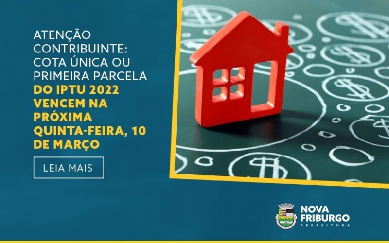 ATENÇÃO CONTRIBUINTE: COTA ÚNICA OU PRIMEIRA PARCELA DO IPTU 2022 VENCE NA PRÓXIMA QUINTA-FEIRA, 10 DE MARÇO