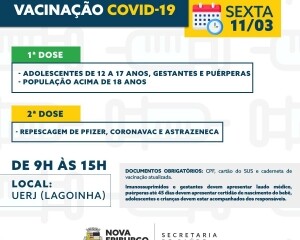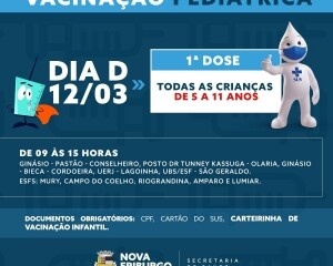 No sábado, dia 12 de março, haverá o Dia D com repescagem para todas as crianças com 5 a 11 anos. Das 9h às 15h, a vacinação será feita no Ginásio Poliesportivo Alberto da Rosa Pinheiro, em Conselheiro Paulino, Posto Dr. Tunney Kassuga, em Olaria, Ginásio Poliesportivo João Antunes Nogueira (Bieca), no Cordoeira, na Universidade Estadual do Rio de Janeiro (Uerj), na Lagoinha, e na UBS/ESF de São Geraldo. Das 9h às 13h, nas Estratégias de Saúde da Família de Mury, Campo do Coelho, Riograndina, Amparo e Lumiar.