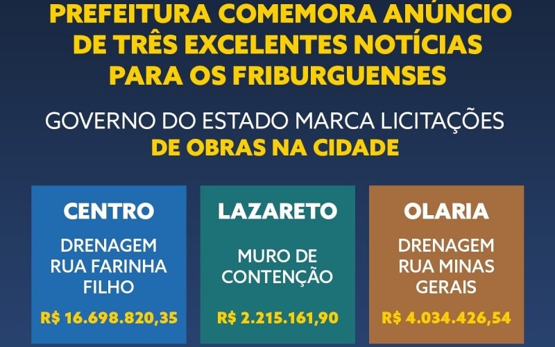 O Diário Oficial do Estado do Rio de Janeiro publicou ontem, dia 24 de fevereiro, o agendamento da licitação para contratação de empresa visando a realização das obras de drenagem pluvial e pavimentação no Centro de Nova Friburgo. Outra grande conquista para o município foi a marcação da licitação para contratar empresa que fará o tão aguardado muro de contenção no Lazareto. A drenagem na Rua Minas Gerais e adjacências também foi anunciada e comemorada.