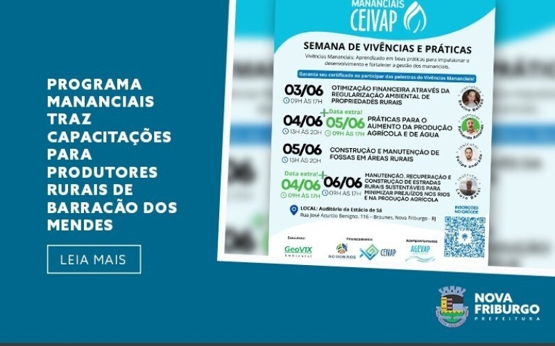 Com o apoio da Prefeitura de Nova Friburgo, por meio da Secretaria de Agricultura e Desenvolvimento Rural e da Secretaria Executiva de Desenvolvimento Regional, o Programa Mananciais promoverá a Semana de Vivências e Práticas, com capacitações gratuitas voltadas para produtores e famílias rurais de Barracão dos Mendes. As palestras serão realizadas de 3 a 6 de junho, no auditório da Universidade Estácio de Sá. As inscrições estão abertas e podem ser feitas online, pelo link: https://linktr.ee/geovixmananciais.