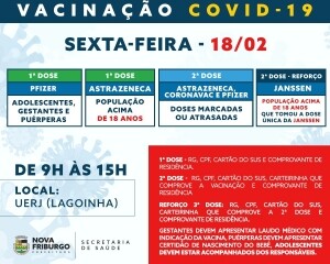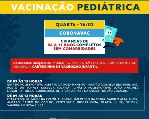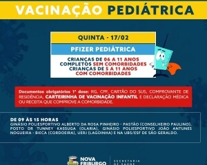 A Secretaria Municipal de Saúde de Nova Friburgo irá vacinar todas as crianças com mais de 6 anos, sem comorbidade ou deficiência permanente, na quarta e quinta-feira, 16 e 17. Ainda continuará sendo oferecida a vacina da Pfizer pediátrica a todas as crianças entre 5 e 11 anos que são do grupo de risco.