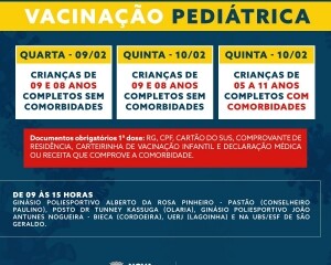 Na quarta e quinta-feira, dias 9 e 10, acontece a vacinação pediátrica. A prefeitura abriu a imunização para crianças com 9 e 8 anos que não têm comorbidades. Além disso, quem tem de 5 a 11 anos e é do grupo de risco (comorbidade ou deficiência permanente) poderá tomar a vacina no dia 10.