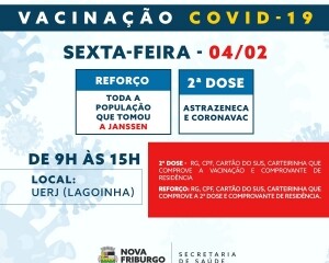 Na sexta-feira, 4, na Universidade Estadual do Rio de Janeiro (Uerj), na Lagoinha, a vacinação de segunda dose continua com imunizantes da Astrazeneca e Coronavac. Além disso, na sexta, a Janssen estará disponível para quem precisa reforçar a imunização com essa segunda aplicação.