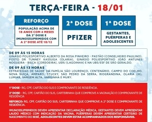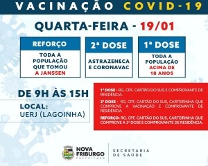 A Secretaria Municipal de Saúde continua nesta semana a vacinação contra covid-19 em Nova Friburgo. O reforço para imunossuprimidos, que completaram o esquema vacinal até dia 20 de dezembro, e para toda a população com mais de 18 anos que já tem quatro meses da segunda dose será oferecido terça e quinta-feira, 18 e 20. Já as pessoas que receberam a dose única da Janssen receberão o reforço na quarta-feira, 19, na UERJ.