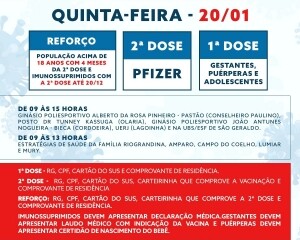 Em relação à segunda dose, nesta semana, haverá vacinação de Astrazeneca, Pfizer e Coronavac para quem ainda não se imunizou e está com a vacina marcada para este período. Também acontecerá repescagem de primeira dose para toda a população do município.