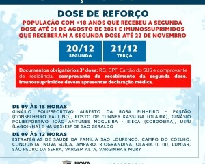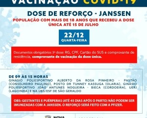 Com o recebimento de 2.650 doses da Janssen, na quarta-feira, dia 22 de dezembro, quem recebeu a dose única poderá tomar o reforço do mesmo laboratório, conforme orientação do Ministério da Saúde.