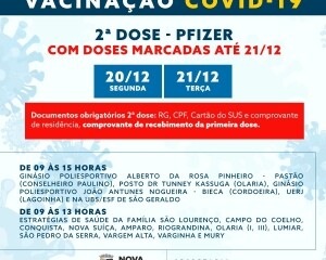 A Secretaria de Saúde ainda promoverá na segunda e terça-feira, 20 e 21 de dezembro, a aplicação da segunda dose da Pfizer para quem está com a dose aprazada, ou seja, marcada, e a repescagem de primeira aplicação para toda a população com mais de 12 anos.