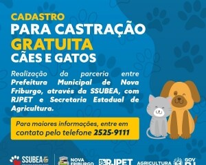 A Prefeitura de Nova Friburgo, através da Secretaria Municipal do Meio Ambiente e Desenvolvimento Urbano Sustentável, por meio da sua Subsecretaria do Bem-Estar Animal (SSUBEA), em parceria com a Secretaria de Estado de Agricultura, Pecuária, Pesca e Abastecimento e da Subsecretaria de Proteção e Bem Estar Animal (RJPET), informa que o município foi selecionado para participar da fase experimental do Programa de Castração da RJPET.