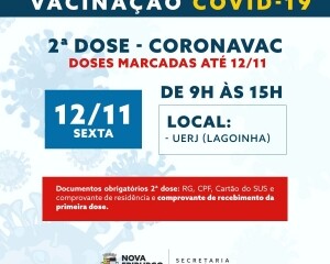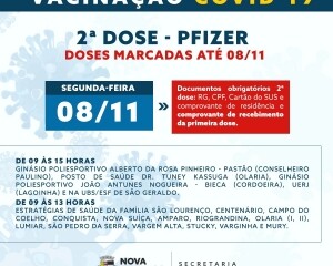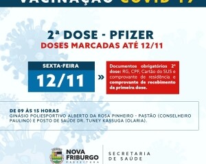 Na segunda-feira, 8, recebe a vacina quem está com a segunda dose marcada até a presente data. Na terça, 9, a aplicação será realizada em quem está com a vacina agendada até esse dia. Na sexta, 12, a imunização é feita no público que está com a segunda dose marcada até o dia 12, em Olaria e Conselheiro Paulino.