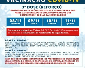 De segunda à quinta-feira, a terceira dose será realizada em profissionais de saúde e idosos que já completaram seis meses do recebimento da segunda aplicação. Já os imunossuprimidos que completaram o esquema vacinal há pelo menos 28 dias, também poderão receber a dose de reforço.