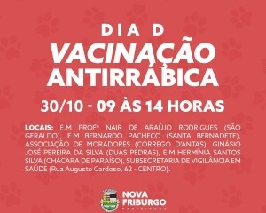 Dando continuidade à campanha de vacinação antirrábica em Nova Friburgo, a Secretaria Municipal de Saúde, por meio da Subsecretaria de Vigilância em Saúde, promoverá mais um Dia D no próximo sábado, 30 de outubro.