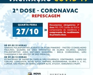 VACINAÇÃO COVID: PREFEITURA REALIZA REPESCAGEM DE SEGUNDA DOSE DA CORONAVAC NESTA QUARTA-FEIRA, 27
