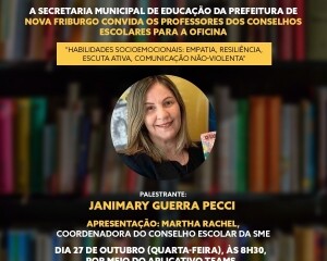 A Secretaria Municipal de Educação da Prefeitura de Nova Friburgo realizará, para os professores representantes do segmento professor dos conselhos escolares das unidades, a oficina "Habilidades Socioemocionais: Empatia, Resiliência, Escuta Ativa, Comunicação Não-Violenta", com Janimary Guerra Pecci, no dia 27 de outubro (quarta-feira), às 8h30, por meio do aplicativo Teams. A apresentação será da coordenadora do Conselho Escolar da SME, Martha Rachel.