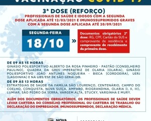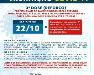 Ainda neste dia, terá a imunização com a terceira dose para idosos e profissionais de saúde que receberam a segunda aplicação até o dia 12 de março e imunossuprimidos graves com a segunda aplicação realizada até o dia 20 de setembro.