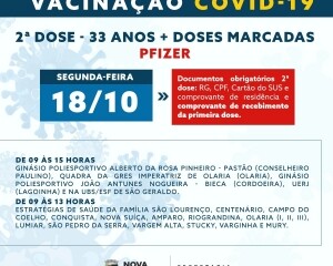 Na segunda-feira, 18, pessoas com 33 anos e de outras faixas etárias que estão com as doses da Pfizer aprazadas, ou seja, marcadas até a presente data, poderão receber a segunda aplicação em um dos pontos de vacinação.