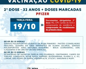 Na terça-feira, 19, também acontece a vacinação da segunda dose da Pfizer, mas para quem tem 32 anos ou está com a vacina marcada até o dia 19. A vacinação de reforço deste dia será para idosos e profissionais de saúde com o esquema vacinal completo até o dia 12 de março e imunossuprimidos com a segunda dose recebida até dia 21 de setembro.