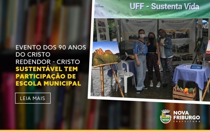 O Cristo Redentor está completando 90 anos neste mês e, em comemoração, o evento 90 anos do Cristo Redentor - Cristo Sustentável está sendo realizado até o próximo sábado, 16, no Rio de Janeiro. Na ocasião, 40 projetos de impacto socioambiental estão em exposição. Convidados pela Universidade Federal Fluminense (UFF), devido a participação do projeto Zero Water Day, no ano passado, a Escola Municipal Alcides Francisco Brantes, do município de Nova Friburgo, participou do evento nesta terça-feira, 12. Estiveram presentes para representar a unidade a diretora Renata Ouverney Braz, Tatiane Fernandes da Fonseca, diretora adjunta e professora, além da também professora Geruza de Oliveira Jorge.