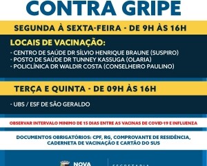 Já na UBS/ESF do bairro São Geraldo, a aplicação da vacina contra influenza acontece neste mesmo horário, às terças e quintas-feiras.