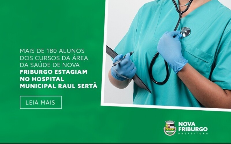 Por meio das secretarias municipais de Saúde e de Ciência e Tecnologia, Inovação e Educação Profissionalizante e Superior, 187 estudantes de cursos da saúde de Nova Friburgo estão estagiando no Hospital Municipal Raul Sertã. Os estagiários estão atuando nas áreas de clínica médica, Central de Tratamento de Urgência (CTU), cardiologia, ortopedia, pediatria, farmácia, fisioterapia, serviço social, laboratório e radiologia.