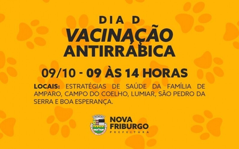Pensando nisso, no próximo sábado, 09, a Secretaria Municipal de Saúde, por intermédio da Divisão de Vigilância em Saúde Ambiental, em parceria com a Secretaria de Estado de Saúde, realizará um dia D de Vacinação antirrábica em cães e gatos nos bairros da zona rural de Nova Friburgo.