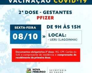 Na terça-feira, 05, também acontecerá a vacinação de Pfizer para quem tomou a primeira dose desse imunizante. E na sexta-feira, 08, será realizado a aplicação de segunda dose da Pfizer em gestantes que já haviam recebido essa vacina.