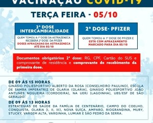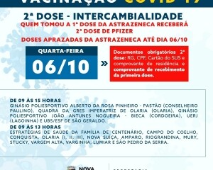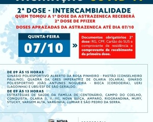 A intercambialidade será feita com a Pfizer para os cidadãos que estão com as doses da Astrazeneca marcadas para essa semana. A aplicação será realizada na terça, quarta e quinta-feira, dias 05, 06 e 07 de outubro.