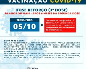 Em relação a terceira dose, que já foi iniciada em institucionalizados, a vacina será aplicada, na terça-feira, 05, em idosos com mais de 90 anos e que já completaram seis meses do recebimento da segunda dose. Na sexta, 08, recebem a dose de reforço os pacientes com câncer em tratamento de quimioterapia e pacientes renais crônicos em hemodiálise.