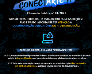 A Prefeitura de Nova Friburgo, por meio da Secretaria Municipal de Cultura, lançou o Edital “ConectArte II”, na noite da última terça-feira, 28, para seleção de Projetos Culturais. Fazedores de Cultura podem inscrever suas propostas até o dia 22 de outubro de 2021. Esta segunda edição contemplará 74 projetos que serão financiados com recursos do Fundo Municipal de Cultura, através da Lei Emergencial de Cultura Aldir Blanc. Cada proponente selecionado receberá o incentivo bruto no valor de R$ 1.500,00.