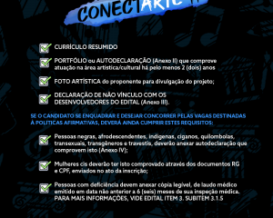 A chamada pública vai selecionar projetos de arte popular, artes visuais, artes urbanas, artesanato, audiovisual, circo, dança, folclore, fotografia, literatura, música, teatro, poesia, saberes tradicionais e afins. Uma comissão julgadora formada por três membros fará a análise da documentação e conteúdo estabelecidos no edital.