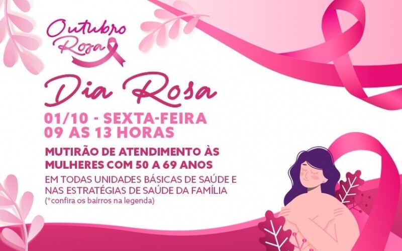 Dando início às ações em celebração ao Outubro Rosa, mês de conscientização e combate ao câncer de mama, a Prefeitura de Nova Friburgo, através da Secretaria Municipal de Saúde, realizará um Dia Rosa nesta sexta-feira, dia 1° de outubro, em todas as unidades de saúde da cidade.