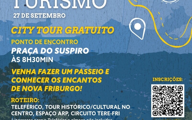 A Prefeitura de Nova Friburgo, através da Secretaria Municipal de Turismo, em parceria com a Associação de Guias de Turismo de Nova Friburgo (Ascigtur-NF), está organizando um city tour gratuito no dia 27 de setembro, em comemoração ao Dia Mundial do Turismo. O ponto de encontro para início do city tour será na Praça do Suspiro, às 8h30.