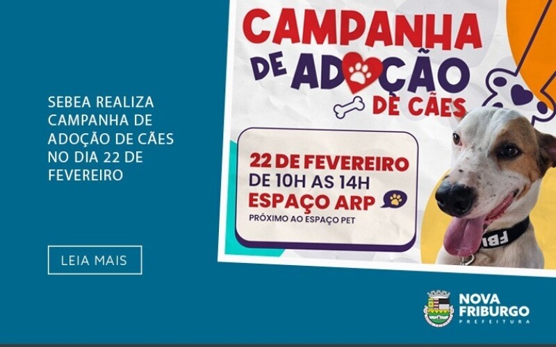 A Prefeitura de Nova Friburgo, por meio da Secretaria de Bem-Estar Animal (Sebea), promoverá, no próximo dia 22, mais uma campanha de adoção de cães. O evento ocorrerá das 10h às 14h, no Espaço Arp, próximo à área pet. O objetivo da iniciativa é encontrar novos lares para cães que estão sob os cuidados de protetores.