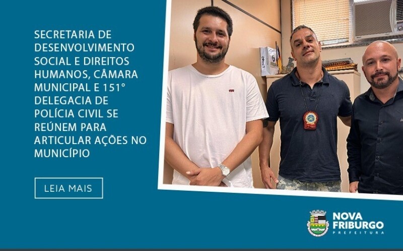 Na tarde desta quinta-feira, 6, foi realizada uma reunião de alinhamento de ações na sede da 151ª Delegacia de Polícia Civil de Nova Friburgo, com a participação do secretário de Desenvolvimento Social e Direitos Humanos, Yuri Guimarães, do vereador municipal Max Bill e do delegado titular da 151ª DP de Polícia Civil, Herberth Tavares.